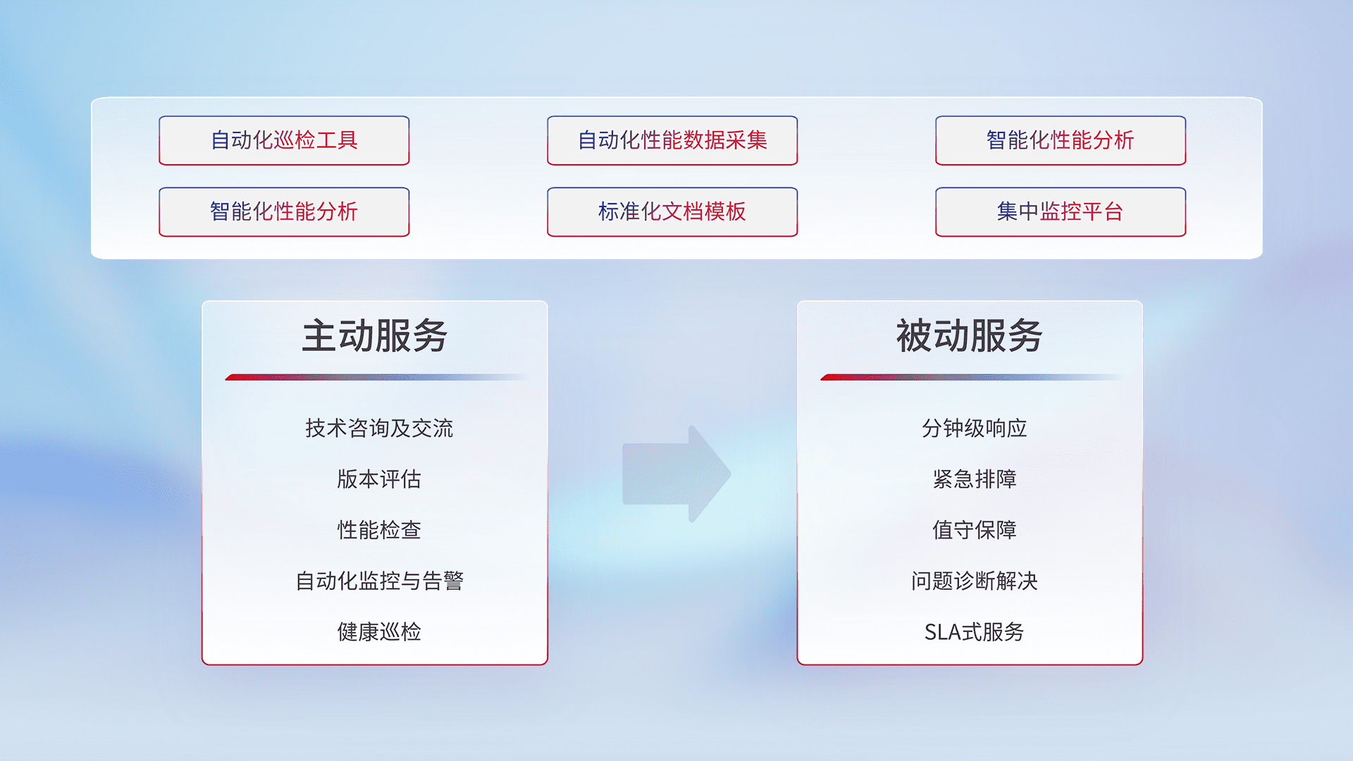 智能化工具和标准化文档,,,保障服务质量,,提供主动服务(包含技术咨询、、、版本评估、、性能检查、、、、自动化监控与告警、、健康巡检)和被动服务包含(分钟级响应、、紧急排障、、值守保障、、问题诊断解决、、、SLA服务)。。。。